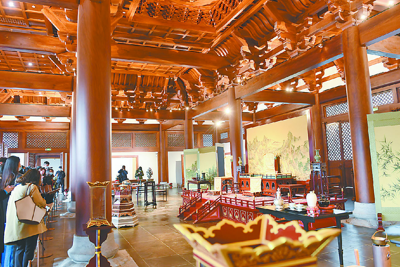 媒体记者在南宋德寿宫遗址博物馆重华殿内参观(11月14日摄)。位于浙江杭州的德寿宫遗址是南宋临安城内一处重要的宫苑遗址,1984年首次被发现。2020年12月,德寿宫遗址博物馆建设正式开工。历经近两年的修建,该馆将在今年11月中下旬对公众开放。