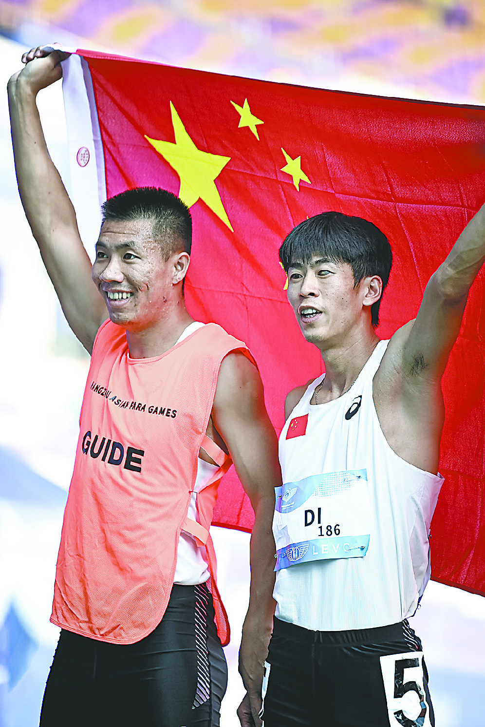 图① 昨日,在田径男子100米T11级决赛中,中国选手邸东东(右)以11秒23的成绩获得金牌。