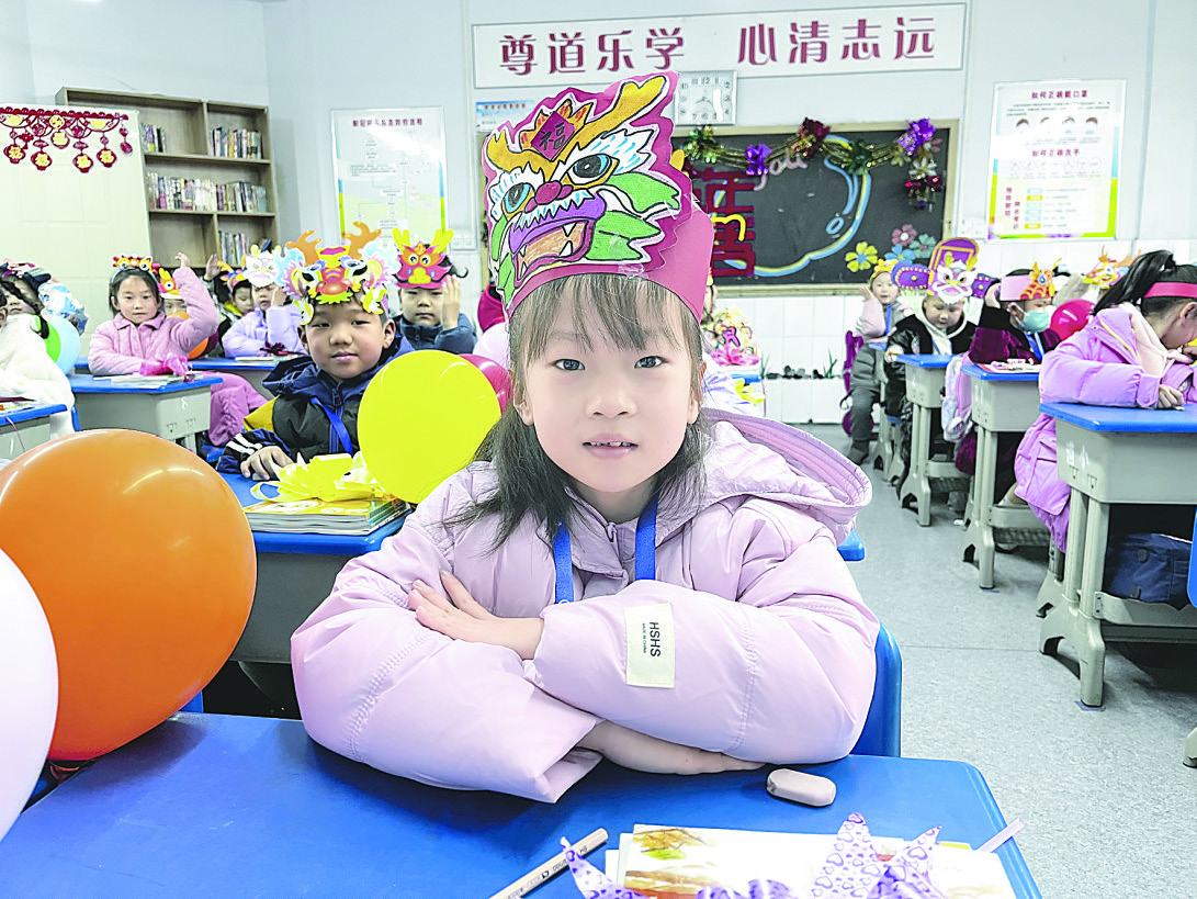 上图 2月25日,新学期报到日,市道清小学学生戴着自制的龙元素“帽子”。