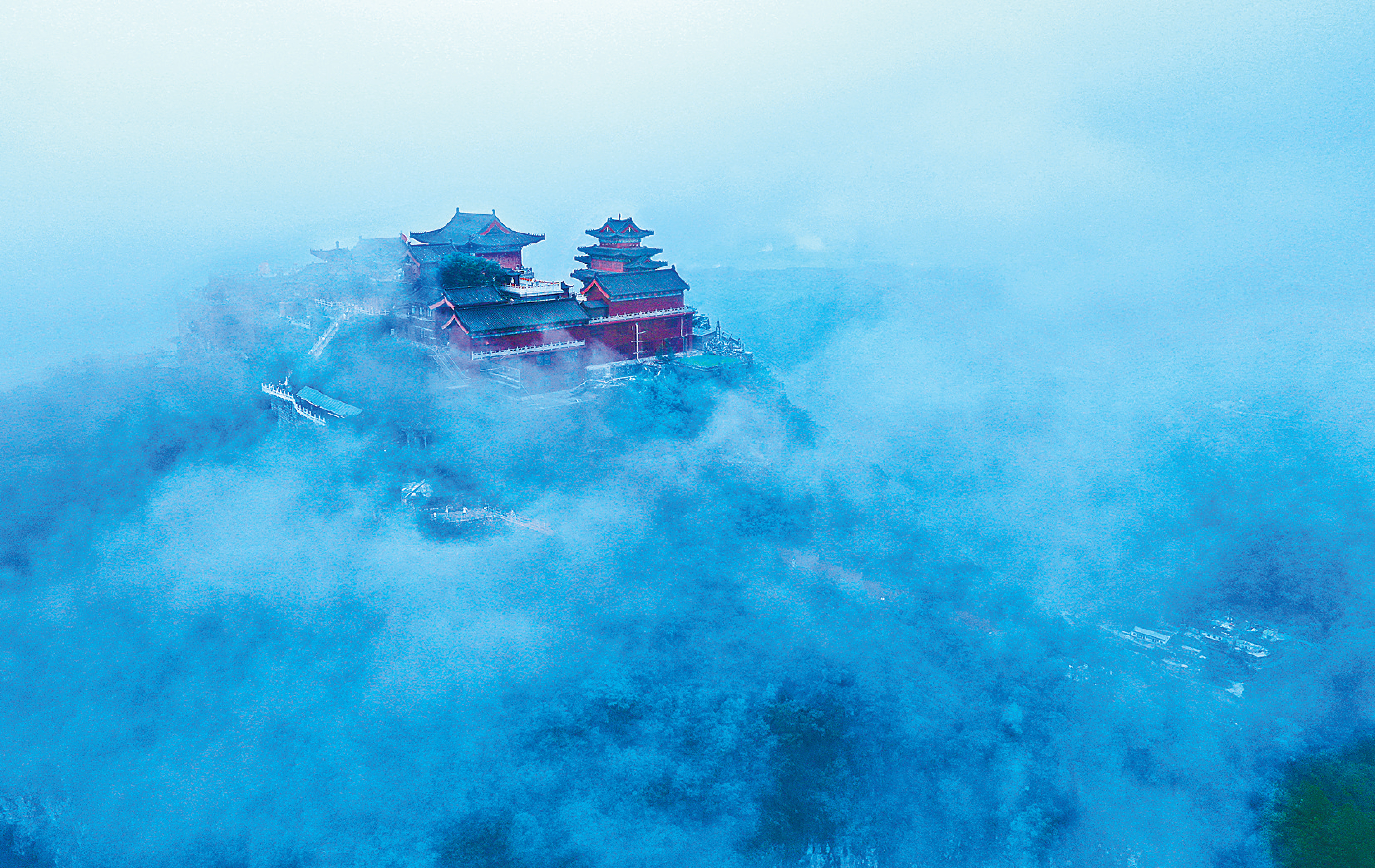 7月25日,云雾缭绕的云台山茱萸峰山顶,古建群在薄雾中若隐若现。山峦间,雾气如轻纱漫卷,红墙黛瓦的建筑在云雾里时显时藏。近期,受连续降水影响,云台山出现了连日不绝的壮美云海景观,吸引众多游客前来观赏打卡。