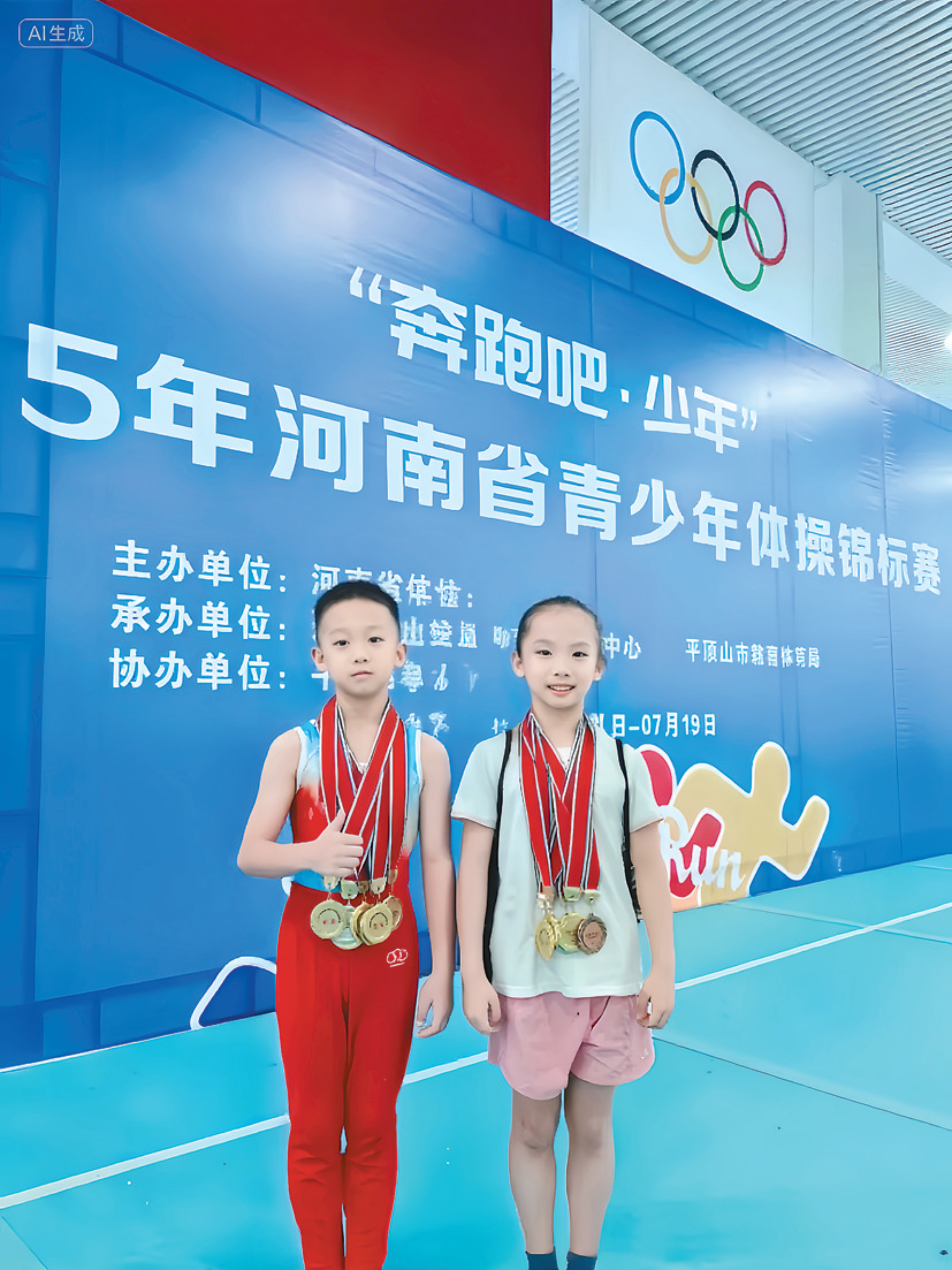 最终,小花夺得9岁组女子个人全能金牌、女子平衡木金牌、女子自由操金牌,小树更是狂揽7金——9岁组男子个人全能、自由操、双杠、单杠、跳马、吊环、鞍马金牌。