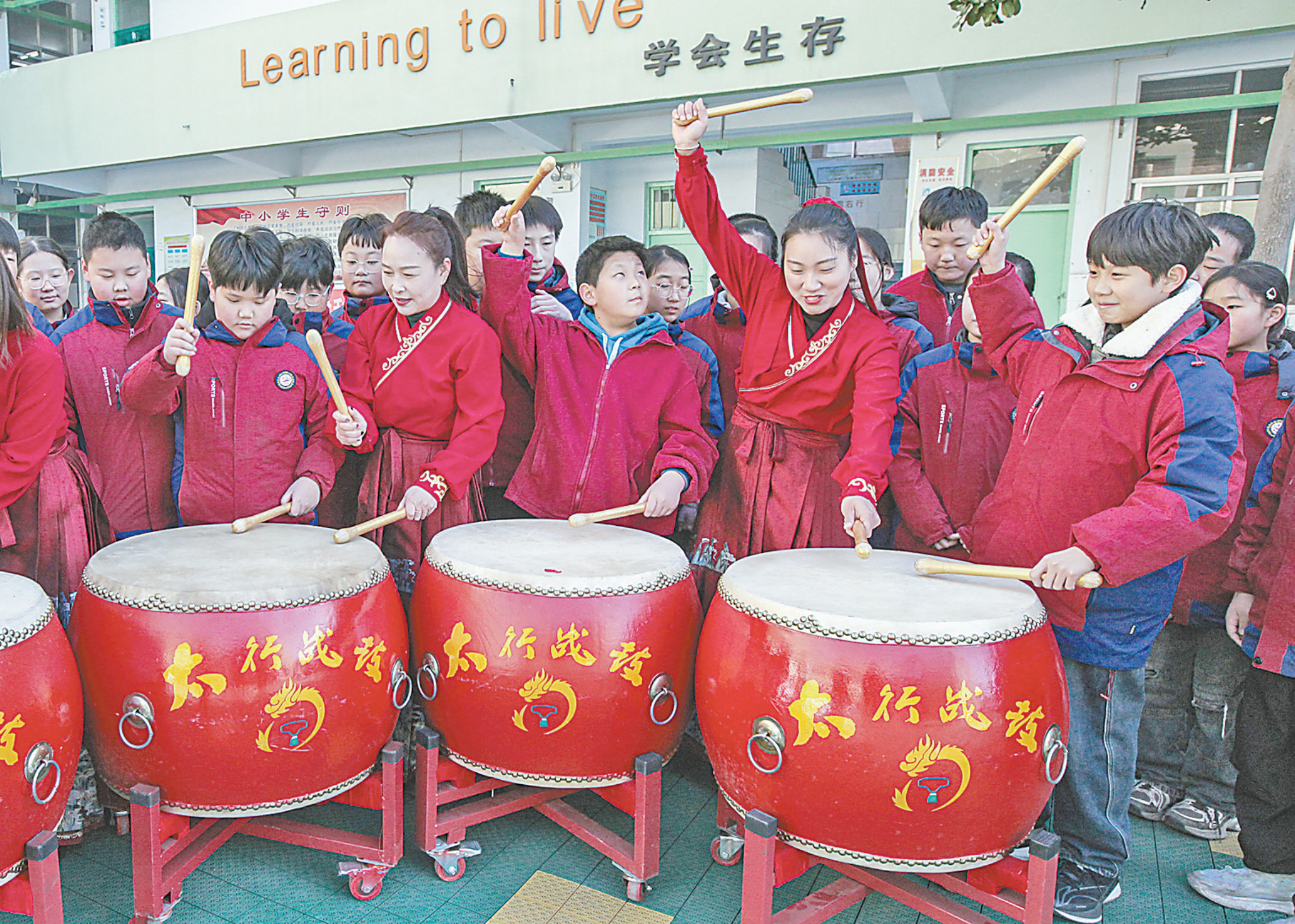 12月15日,博爱县勤奋小学,太行战鼓传承人在教授学生们敲打技巧。为传承弘扬太行战鼓、八极拳等本地非遗文化,博爱县文化馆牵头组织非遗传承人进校园开展系列活动,丰富了学生们课余文化生活,让青少年能够近距离感受非遗文化的厚重底蕴与独特魅力。
