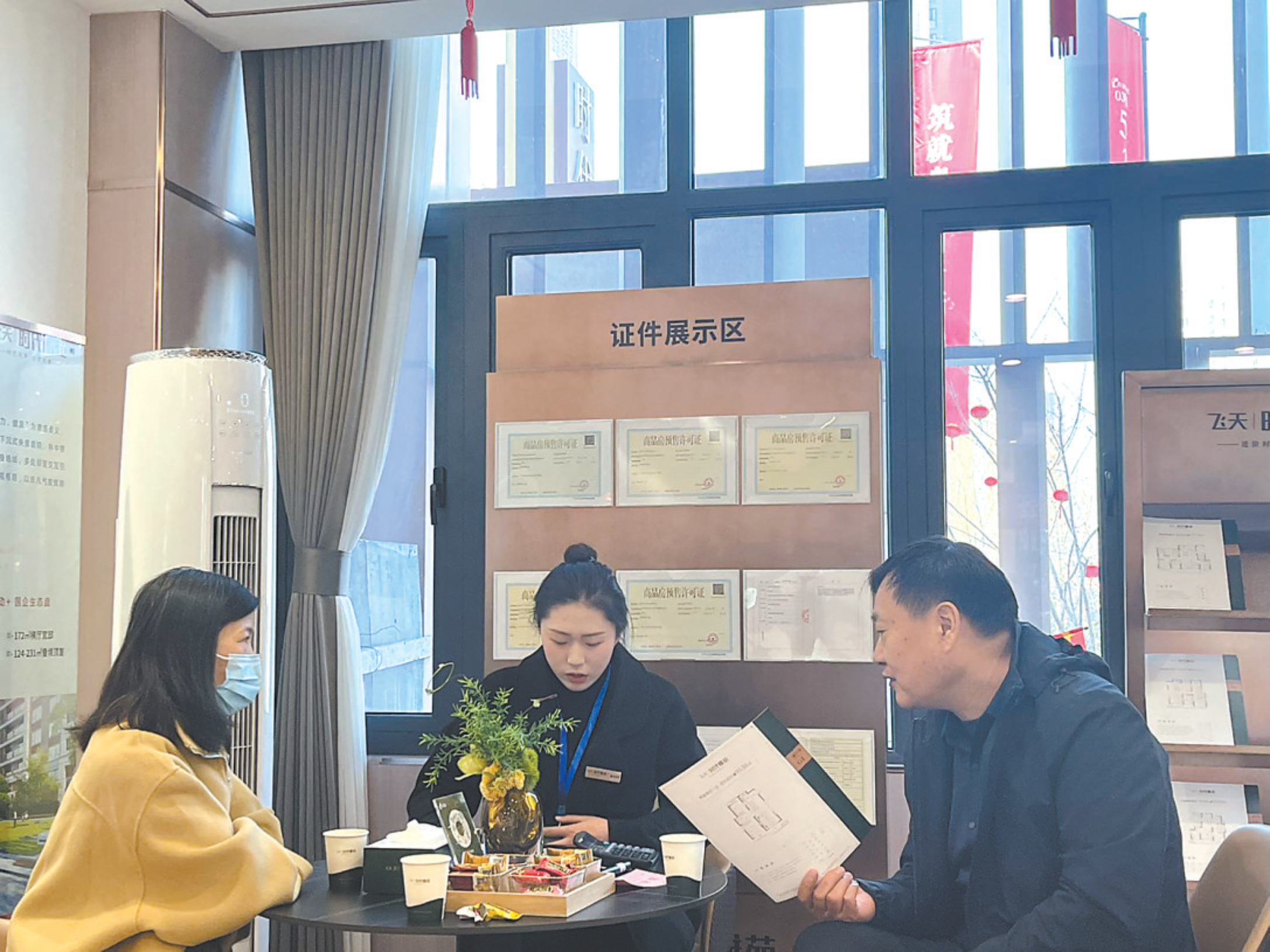 上图 置业顾问为购房者讲解产品细节。 秦 秦 摄